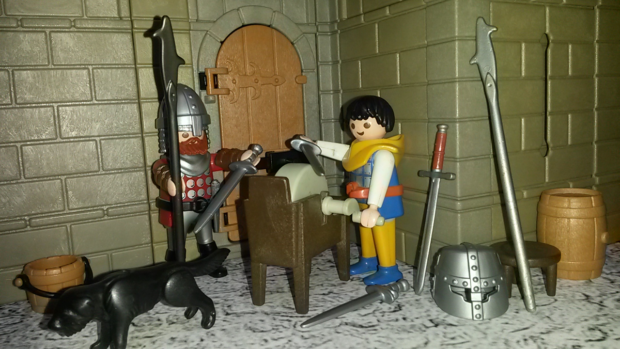 Para afilar y conservar bien sus armas, los soldados del castillo las llevan al afilador.