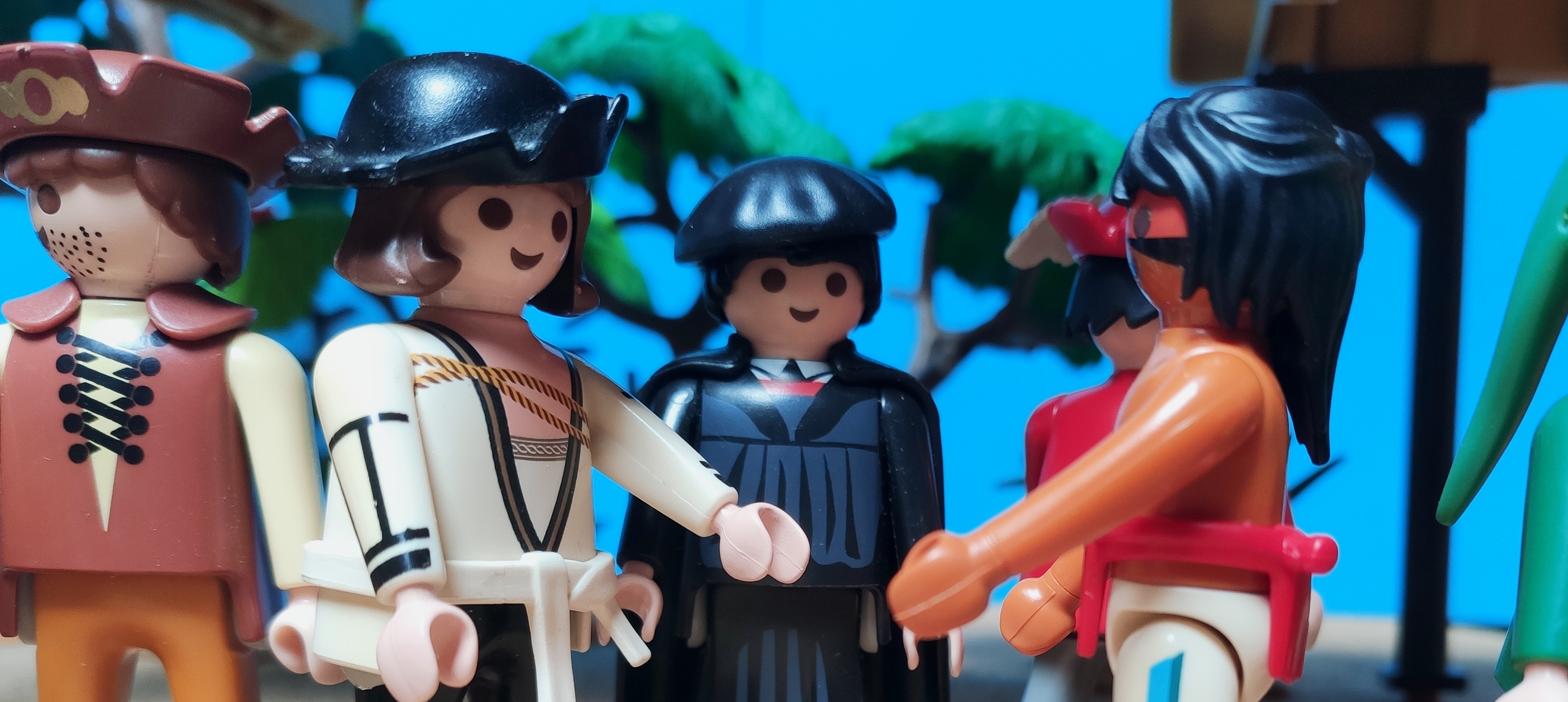 Los indios se sorprenden también del aspecto de los españoles. Les llaman la atención sus armas.